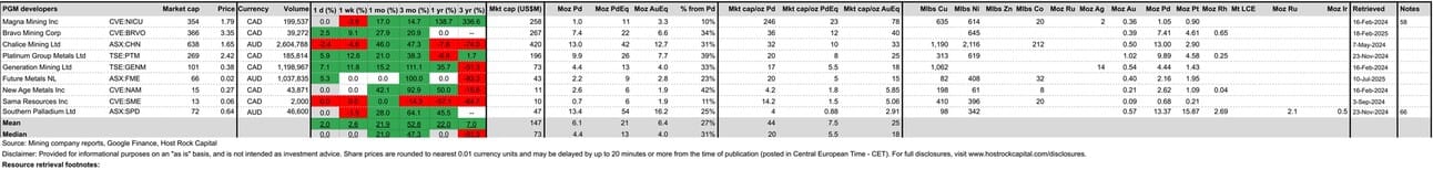 7 July 2025 - Former PGM explorer - now PGM developer - Bravo Mining Corp. (TSXV:BRVO) announced PEA results for its flagship Luanga project in Brazil - a top tier primary PGM junior mining company with a rare 80% of its metal value contribution coming from PGM’s (11% Rh, 40% Pd, and 29% Pt), according to the PEA release. As such, investors like to hold this stock for its high torque on these 3 PGMs and precious metals - especially Rhodium due to this metal’s extreme volatility and BRVO’s relatively abundant Rh resource of 0.65 Moz Rh, making up 11% of project’s metal value. At our estimated 3-month trailing average metal prices, BRVO holds resource of 22 Moz PdEq (6.6 Moz AuEq), and trades at a (11 July) market cap/oz resource of US$12/oz PdEq ($40/oz AuEq) - which had for the past year been at the very top of our 9-company PGM explorer peer group (now 8), and now trades around the upper quartile range of our 9-company PGM developer peer group - just above the mean $7.5/oz PdEq ($25/oz AuEq). The PEA returned a base case post-tax NPV8% of US$1.25b (at metal prices of $1,271/oz Pd, $1,500/oz Pt, $6,000/oz Rh, $3,251/oz Au, and $8/lb Ni - none of which are far from spot currently), from initial capex of only $496m.