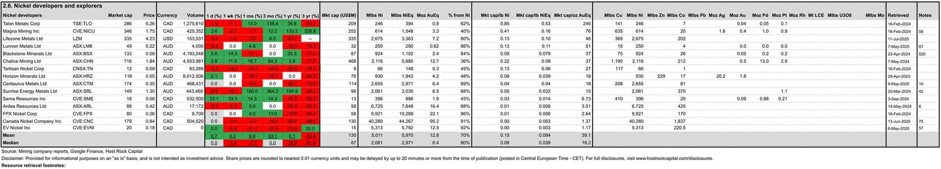 18 July 2025 - Nickel and Cobalt developer Lifezone Metals (NYSE:LZM) made two separate announcements: Filing of feasibility study (FS) for flagship Kabanga project in Tanzania, and further consolidation its ownership in the project to 84% from 69.7% according to a definitive agreement with BHP Bilton UK, with the remaining 16% of project being held by the Tanzanian government. The feasibility study further de-risks this top tier nickel developer and replaces the recent 2025 IACF (Initial Assessment of Cash Flows) in our Peer Table. LZM’s attributable after-tax NPV (at our reference nickel price of US$9.5/lb according to the metal price sensitivity provided in the FS) was US$1.7b, which trades at a P/NAV (market cap/attributable post-tax NPV) of 0.20x - just above nickel developer median 0.10x and still well below mean 0.33x (also at our reference nickel price of $9.5/lb).