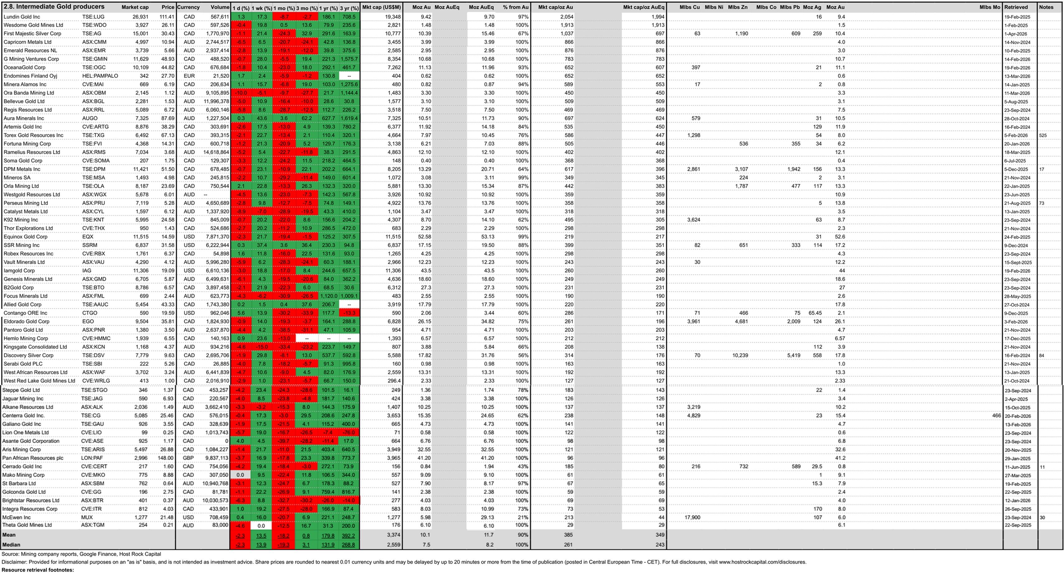 Precious metals prices surged this past week, led by palladium rising +11% to US$1,515/oz, platinum rising +8.3% to $2,000/oz, silver +6.4% to $73/oz, and gold +5.4% to $4,677/oz - helping most silver and gold producer stocks rise by +9% or more; Copper and lithium prices also rose by +2.5% to $5.61/lb Cu and +2.3% to $23,164/t Li carb - helping most copper and lithium mining stocks rising by +4% or more; Covered announcements include annual reserves and resources updates by Hudbay Minerals and First Majestic Silver.
