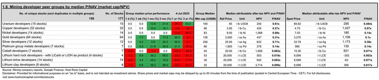 3 July 2025 (intraday) - Gold developer Spanish Mountain Gold (TSXV:SPA) announced results of a PEA for its flagship Spanish Mountain gold project in BC, Canada, which included several changes compared to the prior 2021 PFS, including: larger project scale (now 26 ktpa, was 20 ktpd), improved flowsheet, optimized open pit slopes, upsized power to accommodate future electrification of equipment, filtered/dewatered tailings, and an updated/tightened resource estimate including main deposit Measured and Indicated resources of 292Mt @ 0.44 g/t Au for 4.2Moz Au + Ag credits (total resources are down slightly to ~4.7Moz AuEq). After-tax NPV5% was C$1.0b at US$2,450/oz from initial capital costs of C$1.25b (including $259m project contingency), or at our estimated 3-month trailing average gold price of $3,270/oz NPV was down slightly to US$1.6b. SPA stock traded flat +0% on 3 July intraday following this news (vs. our 67-company gold developer group median that had also been flat +0%), before finishing the week (ending 4 July) up +5.9% (vs. group median +1.7%) to a market cap of C$80m, market cap/oz resource of US$12/oz AuEq (vs. group median $38/oz AuEq) and P/NAV (market cap/post-tax NPV) of 0.035x (vs. group median 0.10x) based on NPV of US$1.67b that was down slightly from old 2021 PFS - at our estimated 3-month trailing average metal prices (US$3,270/oz Au.)