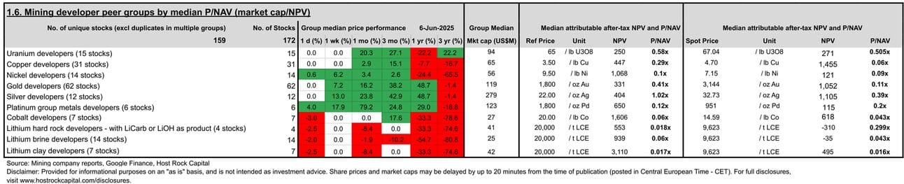 3 June 2025 - Copper developer XXIX Metals (TSXV:XXIX) announced a newly tightened resource estimate for its Opemiska project in Quebec, which paves the way for an upcoming PEA for that project (XXIX already has a 2021 PEA for its other Thierry project). The large, open pit-constrained resource update resulted in a reduced surface footprint, and lower strip ratio through conversion of some waste zones to low-grade zones. The overall estimate grew contained metal just slightly, to a reported 69.65 Mt in the indicated category, grading 0.84% Cu, 0.31g/t Au, 1.82g/t, containing 1.3 Blbs Cu, 0.70 Moz Au, and 4.1 Moz Ag and 80.615 Mt in inferred category, grading 0.28%Cu, 0.17 g/t Au, 0.62 g/t Ag, containing 0.49 Blbs Cu, 0.43 Moz Au, and 1.6 Moz Ag. This grew overall company resources (including the company´s other projects/resources Thierry and Roger) by just under ~1% to 5.3 Blbs CuEq or 7.9 Moz AuEq, now 67% from Cu, 21% from Au, rest from Ni, Ag, Pd, Pt (at our estimated 3-month trailing average metal prices). XXIX stock traded down -12% (on 3 June) intraday following this news (vs. copper developer group median performance of flat +0%), before closing the week (ending 6 June) down -7.7% (vs. peer median flat +0%), to a market cap/lb resource of US$0.004/lb CuEq ($2.63/oz AuEq) - a wide 81% discount to our 31-company copper developer peer group median of $0.021/lb CuEq ($13.8/oz AuEq). On P/NAV (taken as market cap/post-tax NPV), including only the 2021 PEA for Thierry (which will soon be supplemented by another PEA for Opemiska), XXIX trades at 0.12x - a 60% discount (was 46% discount on 3 June) to our copper developer peer group median 0.29x (was 0.21x on 3 June), both at our Reference copper price of $3.5/lb.